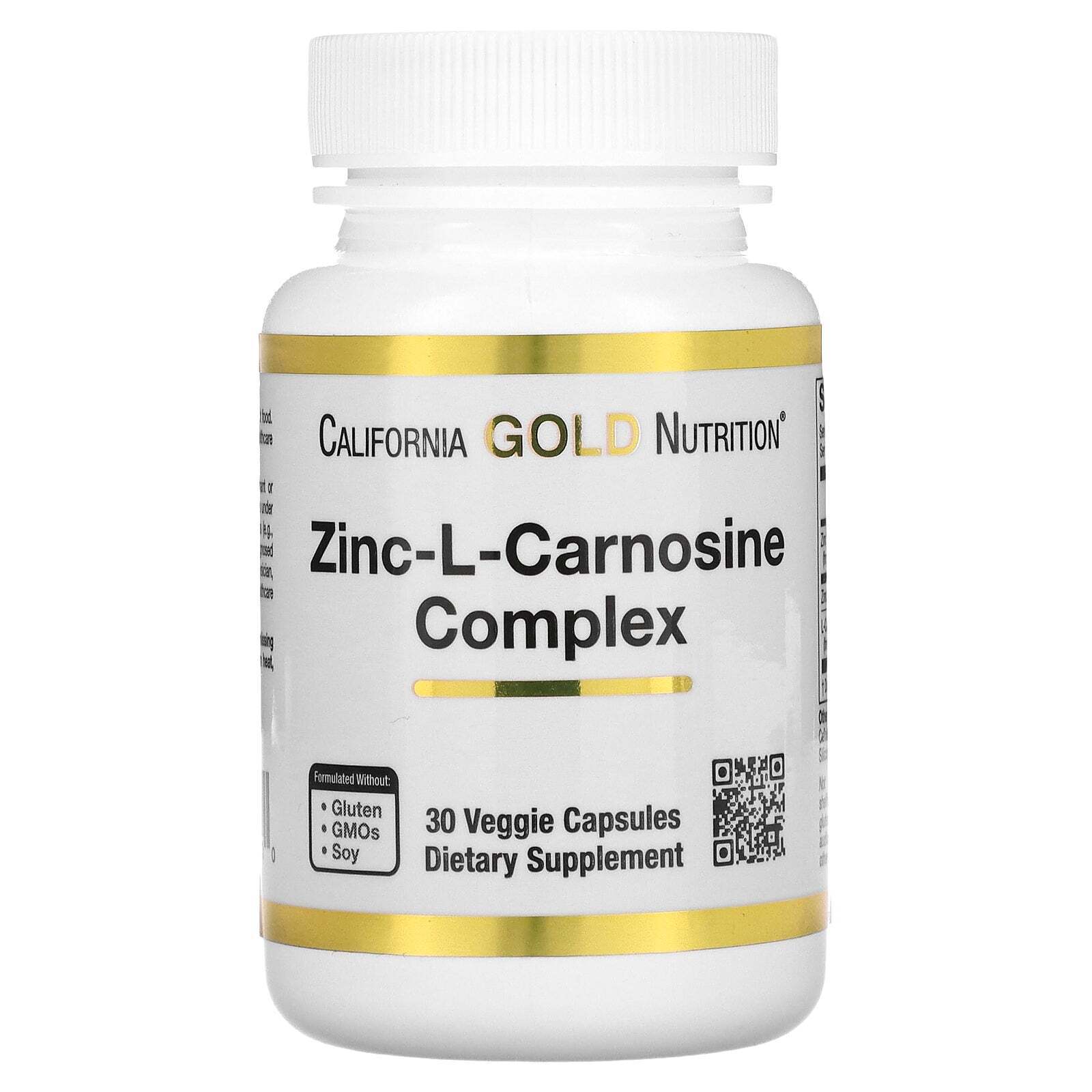 California Gold Nutrition Zinc-L-Carnosine Complex contains zinc-L-carnosine in veggie capsules. It is suitable for vegetarians and vegans and formulated without gluten, GMOs, or soy.