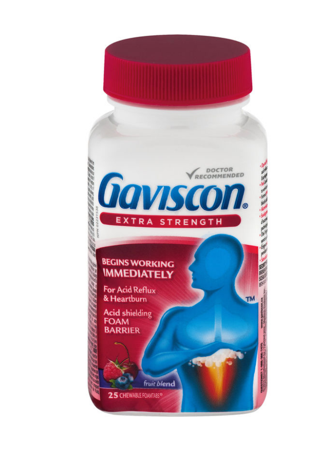 Gaviscon (R) Extra Strength Chrewable Foamtabs begin working immediately. Provides day & night-time relief of heartburn, acid reflux and GERD (Gastro-Esophageal Reflux Disease) symptoms. Doctor recommended Gaviscon (R) forms a protective foam barrier that blocks acid reflux for hours. Free from aluminium, lactose & gluten. Fruit Blend flavour; 25 count. Product information is provided by the product vendor. This content is a summary for informational purposes only and does not have all possible information about this product. It should not be used as a substitute for advice from health care professionals, as this information alone does not assure that this product is safe, effective, or appropriate for you. For more detailed information on this product, including reported and possible side effects and contraindications, refer to the manufacturer's monograph, or speak with a health care provider.