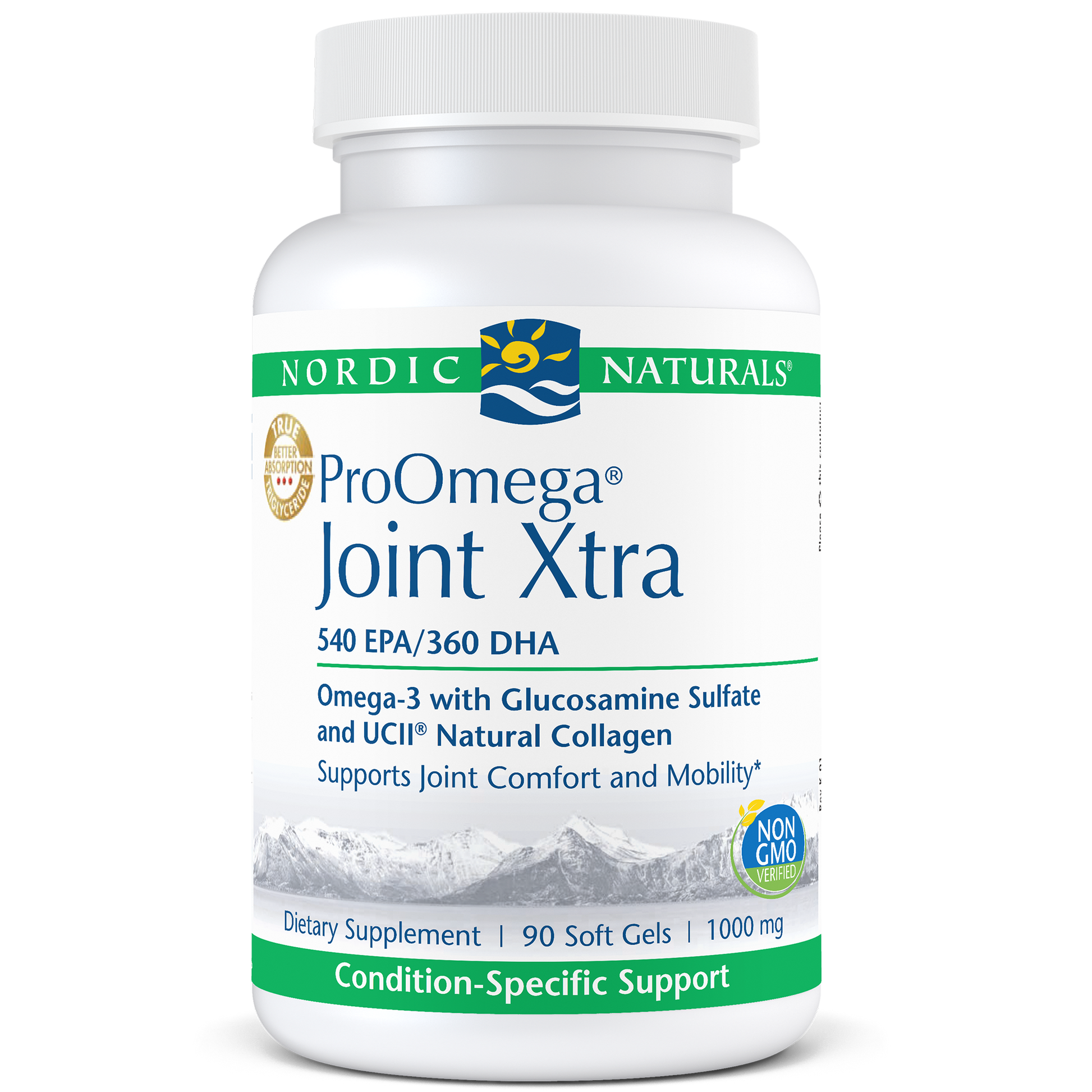 Nordic Naturals developed ProOmega® Joint Xtra based on the latest human clinical trials, which show that the combination of EPA+DHA from fish oil and glucosamine sulfate work better together than glucosamine sulfate alone. They have also added UC-II® Undenatured Type II Collagen to accelerate benefits and effectiveness. UC-II Undenatured Type II Collagen is the primary form of collagen found in cartilage. And whereas many other available forms of Type II collagen are hydrolyzed, which alters the molecular configuration and renders it biologically inactive, the Type II collagen in ProOmega Joint Xtra is undenatured to preserve its native form and thus ensure efficacy. By combining this revolutionary ingredient with Nordic Naturals' industry-leading fish oil and shellfish-free glucosamine sulfate, ProOmega Joint Xtra delivers targeted and accelerated support for joint mobility and comfort in adults of all ages.*